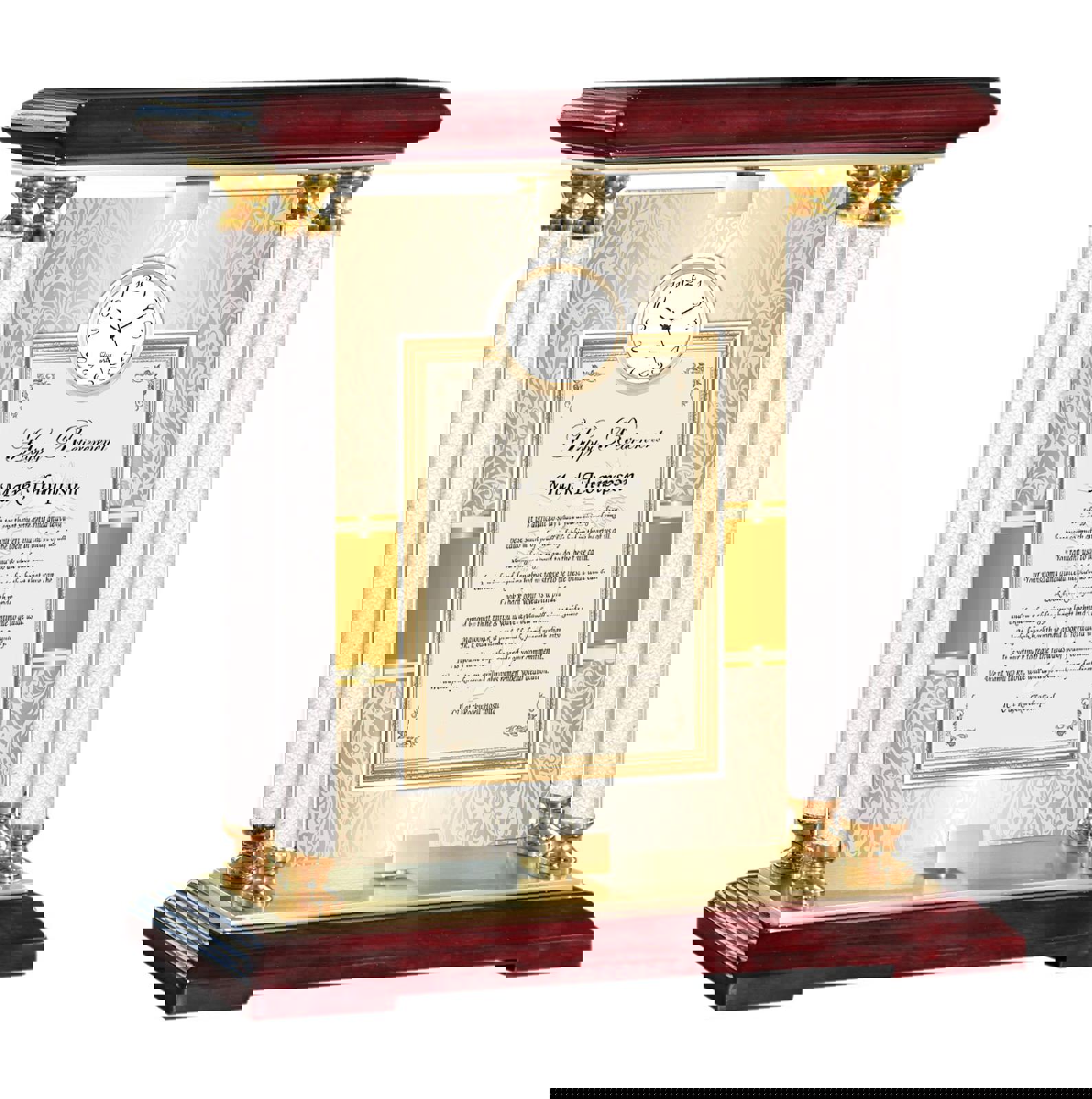 This luxurious gold brass personalized retirement clock is mounted on a wooden base with four column accents filled with spectacular thousands of acrylic crystal diamonds inside the post display settings.