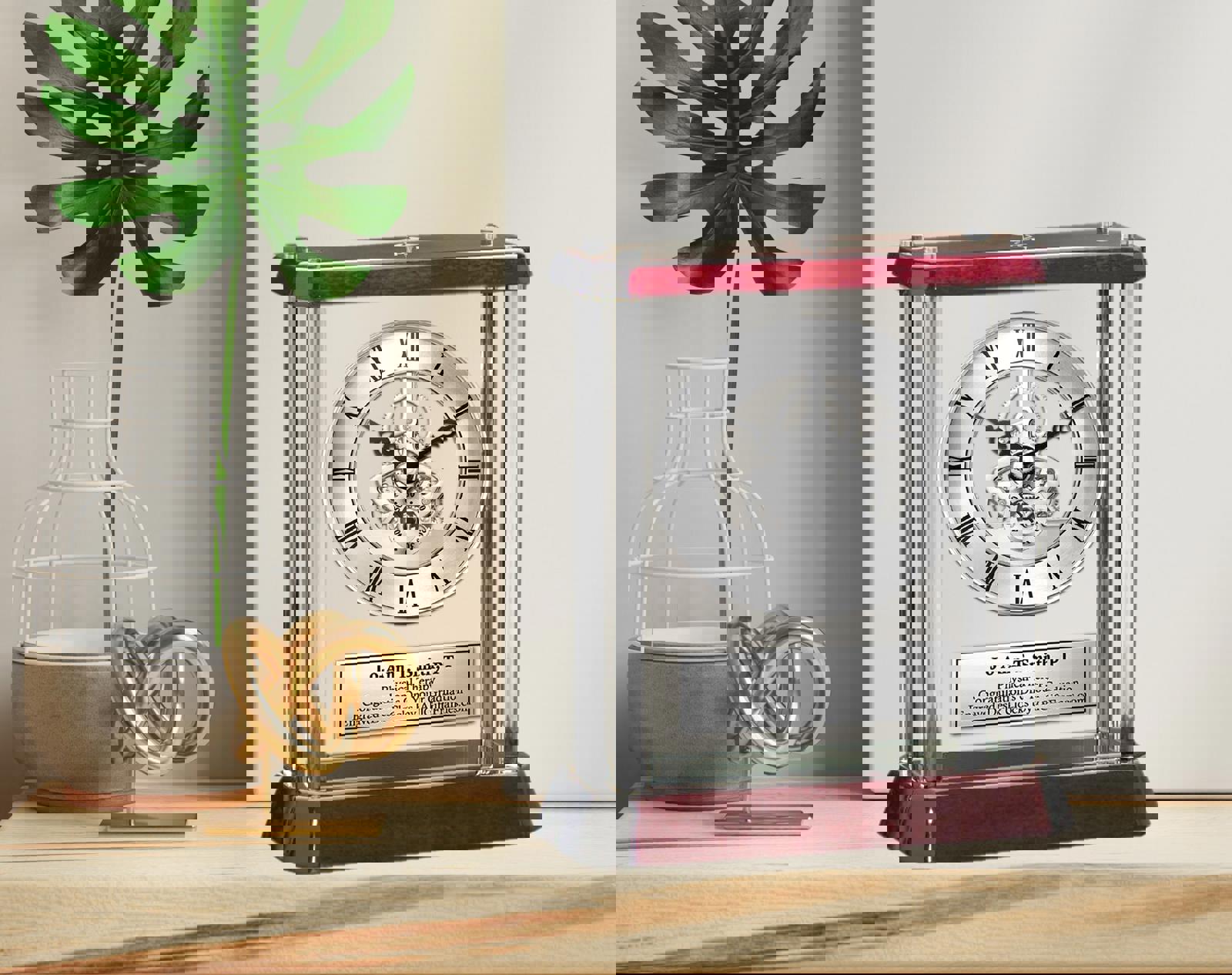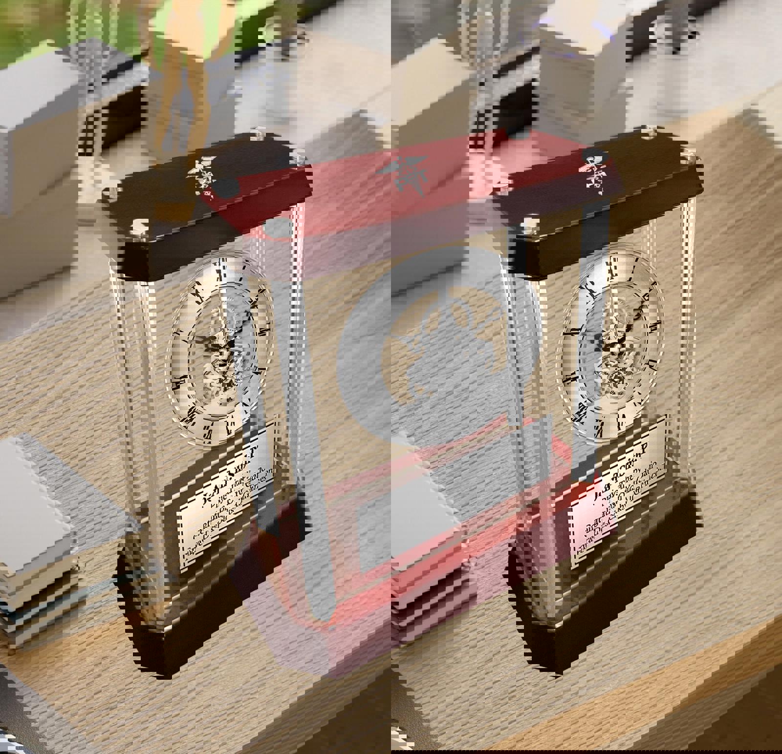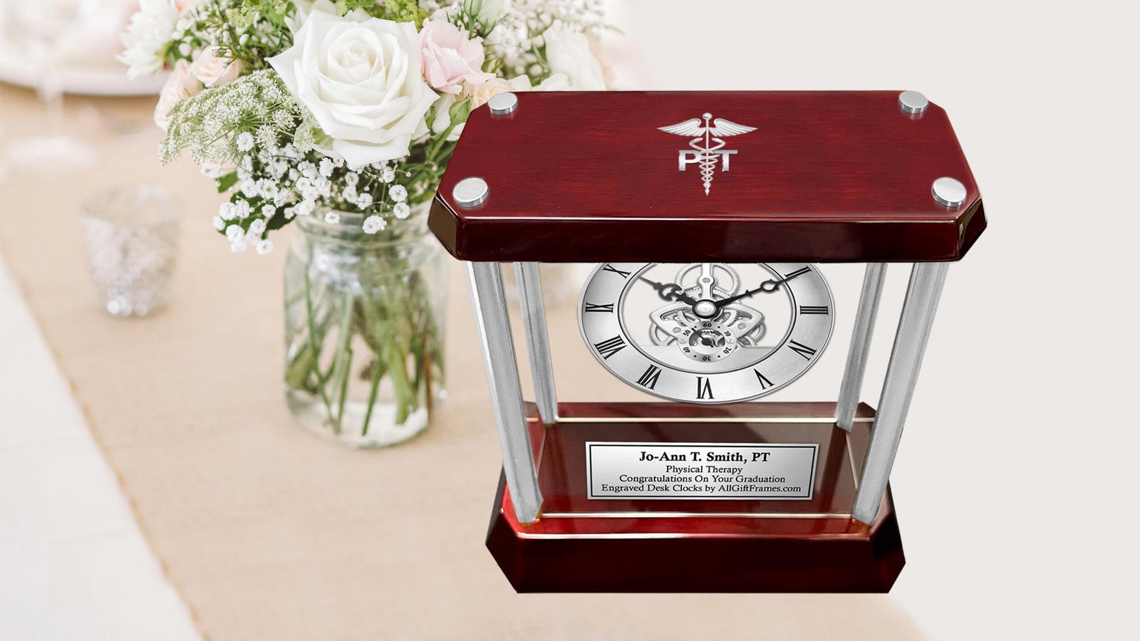 The glossy cherry wood finish top and base creates a unique appreciation personalized gift for the physical therapist. A touch of silver highlights the rich cherry finished wood trim engraved clock. The opulent hues of deep personalized engraved plaque give way to the radiance of your etched inscription. This trophy award timepiece embody the very essence of a quality DPT award recognition clock for the university of college doctor physical therapy school graduate. The passion to be number one is displayed in all success stories. It is the desire to achieve that sets physical therapist apart. They followed their dreams and built solid foundations from which to soar to the top. This table top glass encase silver column Da Vinci mechanical gear clock salutes those efforts.