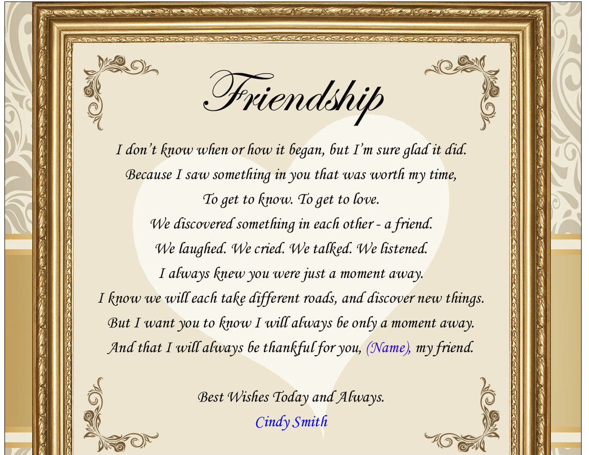 Celebrate your friendship with a gorgeous personalized poetry table clock by Framing Achievement, Inc. This personalized poetry frame desk clock features a traditional mahogany curved shape plaque complete with designer quartz movement clock. Elegant design numerals and second hand complete their displays. A handsome loving decoration for any office or home and a unique heartwarming clock gift. Whether an anniversary or birthday, this personalized poetry table desk clock gift gives a feeling of gracefulness and elegance.