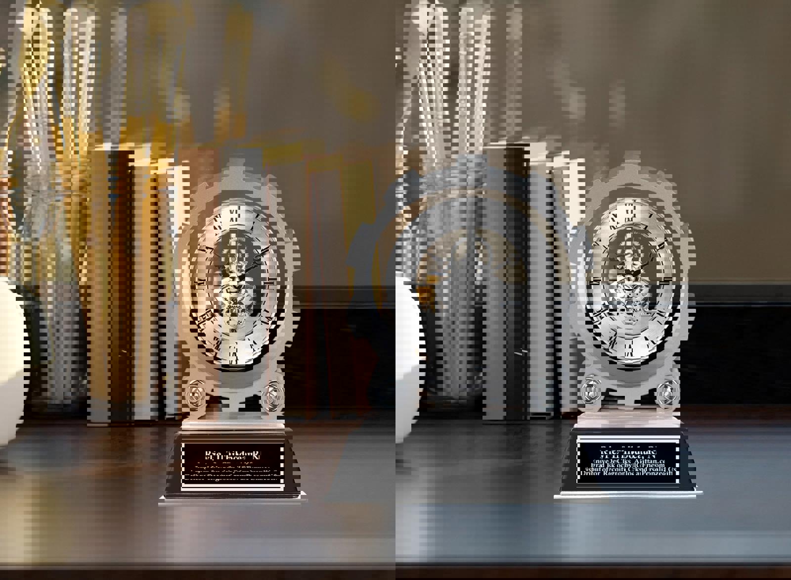 Personalized wood desk clock with silver engraving plate. Congratulation engraved desk clock with distinction. This beautiful engrave desk clock makes a unique retirement, employee recognition, wedding, anniversary or graduation gift present. A unique table desk clock gift idea for coworker, employee, boss, girlfriend, boyfriend, wife, husband, etc.... Personalized clock gifts by Framing Achievement, Inc. creation. Rating high on style and elegance, Framing Achievement's personalized poem photo gifts are the first choice in premium poetry presents for Anniversary, Birthdays, Weddings, Retirement, Graduation and many more occasions. Let our personalized engraved desk clock gift products imagination wander and explore the possibilities that you can create with a custom sentimental meaningful message in our elegant clock gifts. Beautiful Employee Service Award and Recognition Retirement Gift Clocks with Free Engraving.