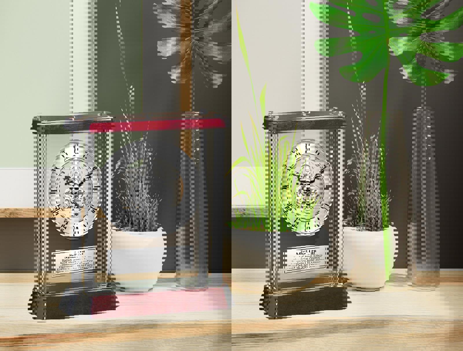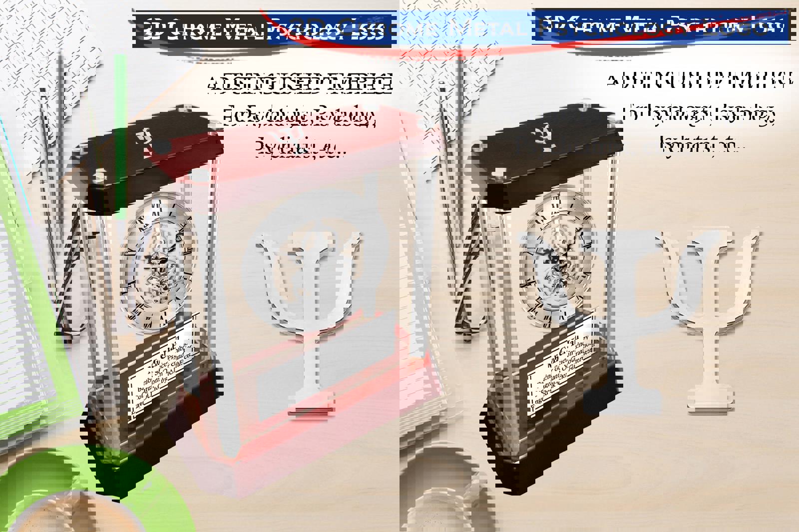 The glossy cherry wood finish top and base creates a unique appreciation personalized gift for the psychologist. A touch of silver highlights the rich cherry finished wood trim desk engraved clock. The opulent hues of deep personalized engraved plaque give way to the radiance of your etched inscription. This trophy award timepiece embody the very essence of a quality years of service award recognition clock for the university of college psychology school graduate, student or retiree. The passion to be number one is displayed in all success stories for any Psychiatrist employee coworker or boss. It is the desire to achieve that sets apart so give them a unique timepiece as a employee years of service award. They followed their dreams and built solid foundations from which to soar to the top. This table top glass encase silver column Da Vinci mechanical gear clock as promotion gift salutes those efforts.