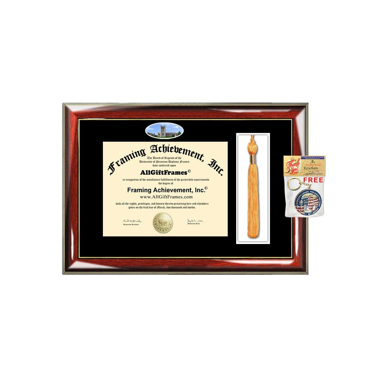 With our tassel diploma case holder Trinity College Connecticut diploma frame with campus photo, the sentimental value are endless. Our variety of graduation degree plaques truly encourages you to create the perfect gift for treasured and priceless degrees and certificates. The certificate frame and college university frame includes a small campus photo image approximately 1.5H x 3W. If you have any questions email us through AchievementGifts (Amazon) or AllGiftFrames. Includes Complimentary Inspirational Quotes Gold Keychain Gift by AllGiftFrames© These graduation diploma frames can display professional certifications and degrees with a campus image. We acknowledge and congratulate high school, college or trade school graduates by providing Trinity College Connecticut diploma framing tassel box service to the alumni. Share the joy of giving and expressing congratulations to the graduate by framing a diploma in an elegant tassel holder degree frame. These premier Trinity College Connecticut diploma tassel holder boxed frames with campus image picture are unique graduation gifts. Manufacture of high quality premium personalized custom Trinity diploma frames and certificate plaques. Whether you're looking for elegant graduation diploma frame gift idea, personalized high school or college graduate gift, law school graduate gift or simply personalize graduation frames, we can help with the customizing gift. Let us be your custom Trinity diploma framing gift shop for a Bachelor, Masters, MBA, Doctorate, PhD, Juris Doctor or medical degree. All certificate college frames are custom made to fit your diploma sizes. Vast selection of college degree frames to fit a bachelor, masters, mba, doctorate, juris doctor, phd, nursing etc.. degrees at cheap prices