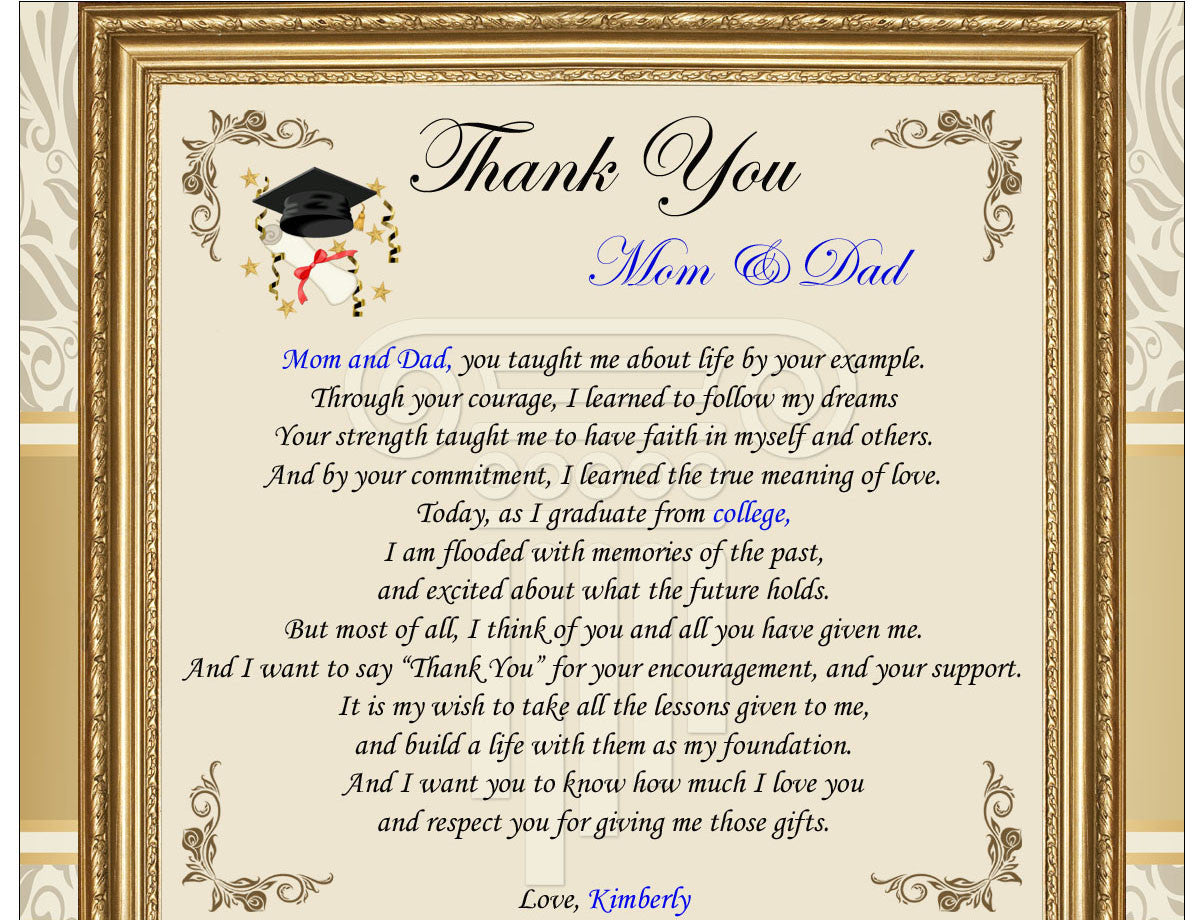Personalized Parents Thank You Graduation Gift from College or High School Graduate. Poetry clock picture frame with 2.5W x 4H photo opening for mom and dad to show your gratitude for their support throughout college or trade school. A beautiful, thoughtful and unique keepsake thank you graduation gift idea honoring your parents support and love Product: TYGP-PGC4.