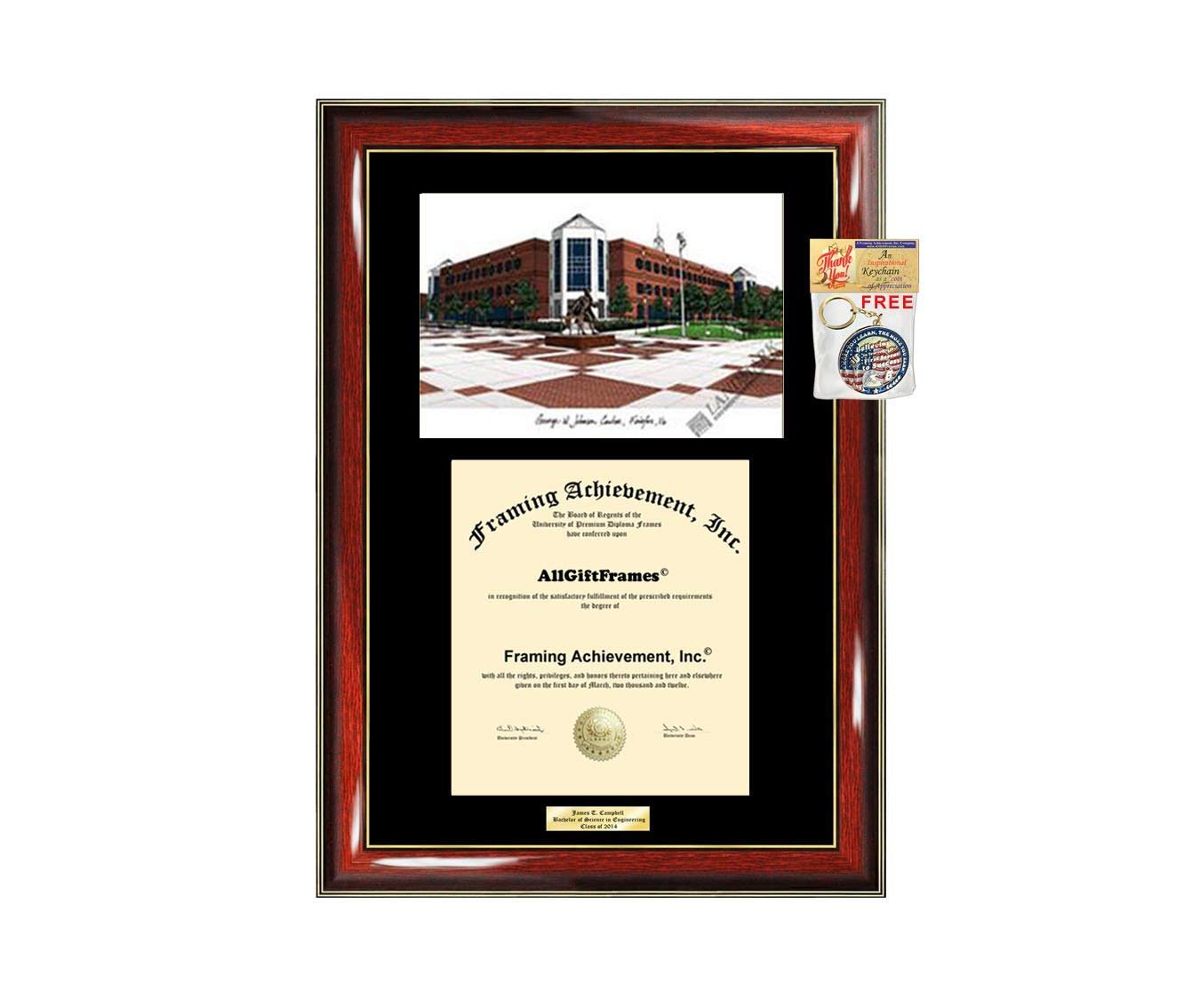 Custom diploma frame with campus university lithograph personalized engraved plate plaque by AllGiftFrames. Our graduation Degree Frame Holder Case includes a campus sketch picture. Diploma Size Info - After you place your order, Email us through AchievementGifts (Amazon) or AllGiftFrames and let us know your "diploma size" "Gold or Silver engraving" and "Personalization Info". Make sure you let us know the correct diploma size. If you do not know, call the school's Registrar's Office and they can tell you the diploma size. We sell university college graduation frames with personalized engraving plate which are beautiful graduate gifts for certificates and degrees. Display your university degree or certificate with a nice custom diploma frame plaque. We offer a variety of high-end wood college diploma frames with Personalization. Our graduation gift college degree frames and university graduation frames are the first choice in premium graduation gifts for alumnis.