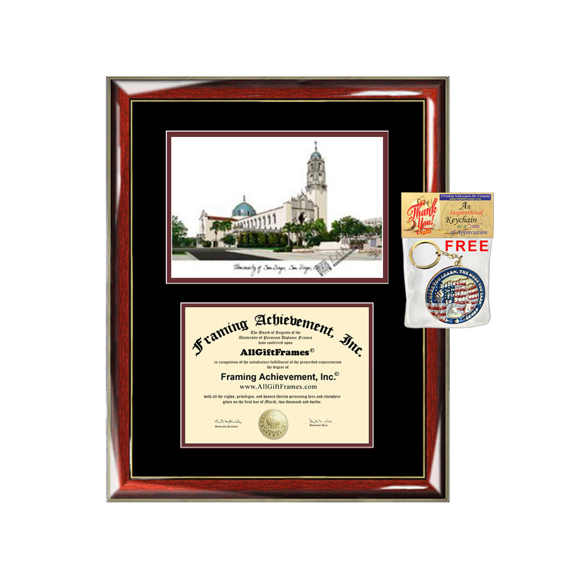 Dazzling. Elegance and Creative, AllGiftFrames manufacture high quality university diploma document University of San Diego frames and certificate frames using state-of-the-art quality control techniques to showcase your achievements. We offer a variety of high-end wood custom college diploma frames. All certificate USD lithograph diploma frames are custom made to fit your diploma sizes. Supplier of custom degree frames and certificate frames with premium wood mouldings and frames. These university USD diploma plaques will display and enhance your success and will make a great wall decor. University Diploma Frames