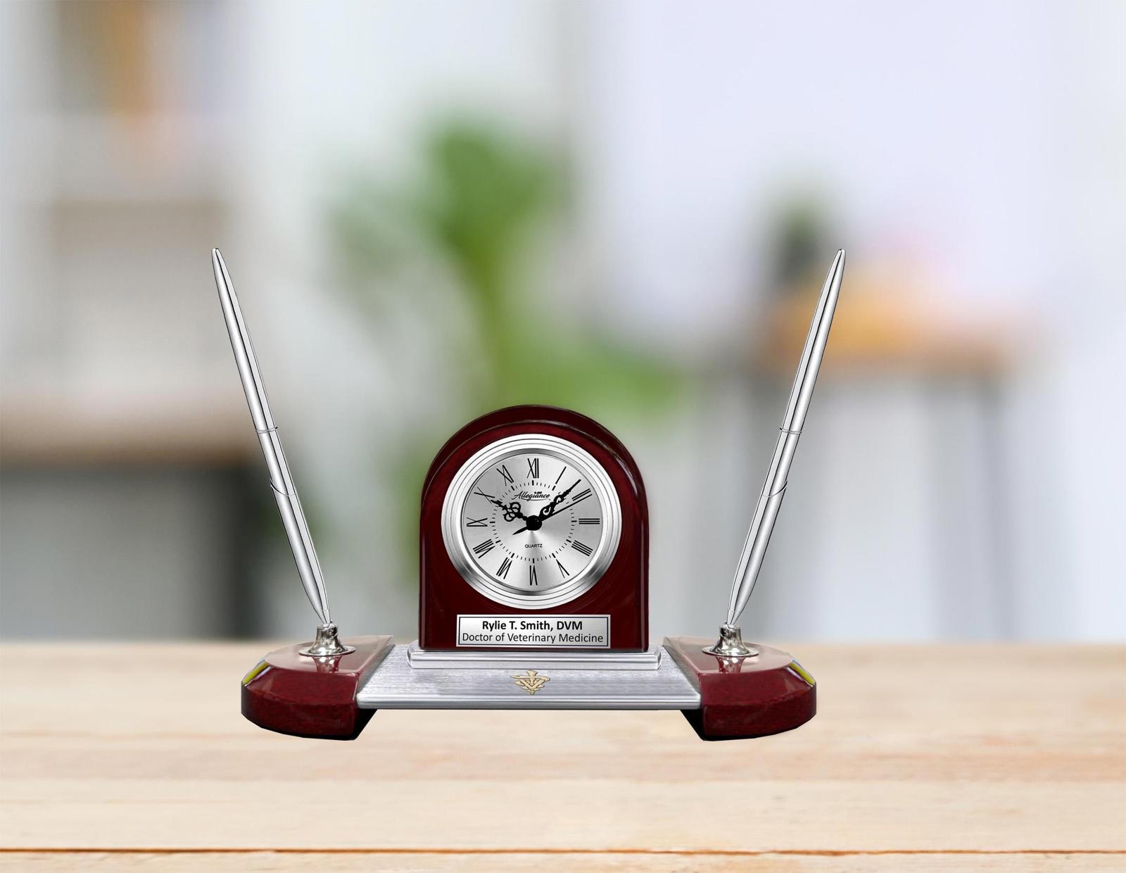 Breathtaking retirement award dual pen nameplate plaque desk clock gift is of an unparalleled design. The craftsmanship of the cherry wood arch clock casing rising from the silver metal base is elegant, affording a most desirable veterinarian retirement award, DVM employee service award, veterinary school graduation gift. From sleek and sophisticated design element emerge coworker service awards and congratulation vet school graduation engraved clock gifts of incomparable splendor.