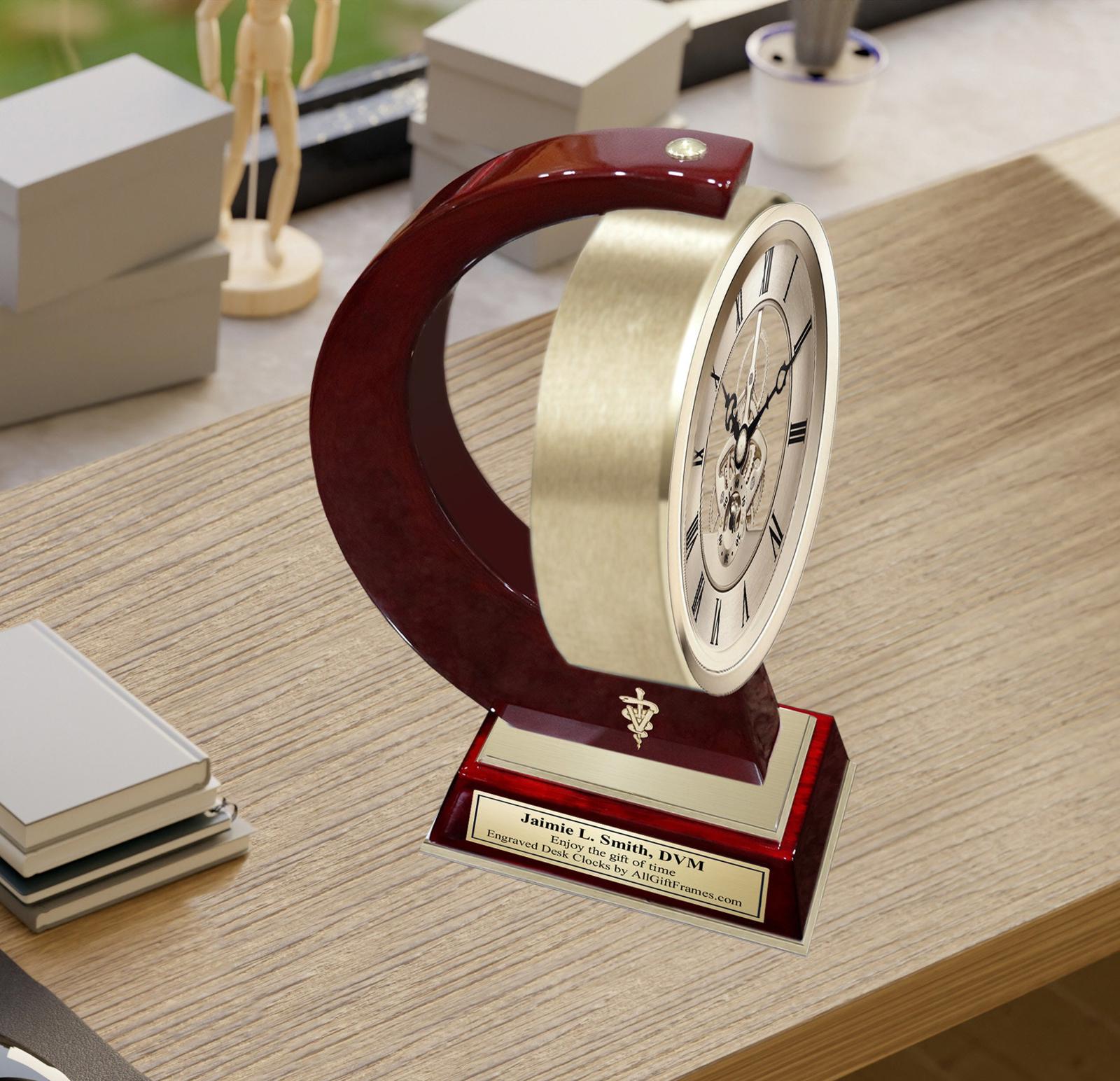 Embrace the exquisite custom craftsmanship & timeless appeal of this dramatic sought after desktop table etched brass gold swivel wooden mechanical moving gear quartz clock. An opulent unique engraved clock for DVM professionals that raises the bar in quality, functional and unique retirement, service award, thank you and veterinarian school graduation gift. Sultry table clock design forms, brilliant metallic gold metals and unique veterinarian, DVM and Doctor of Veterinary Medicine. The veterinarian college school congratulation personalized table top mantel clock built to recognized the veterinarian professional. The gold engraved desk metal mantel clock features a 360 degree manual spinning aluminum clock casing that suspend a mechanical moving mechanism gear clock on cherry wooden base. The objective of giving a recognition, service award, retirement, appreciation, veterinarian school graduation gift is to enhance and recognized achievement to the DVM colleague employee or thank you veterinarian gift. A special unique thank you gift idea for him and her.