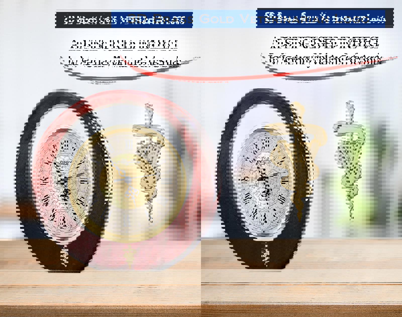 The DVM metallic Venetian design dial element insert clock cradles above the base of the circular glistening polished wood design. A 3D brass metal gold 3D veterinarian logo tops this sleek styled mantel award clock that epitomizes the look of success. Quality materials of cherry wood casing with gold metallic Venetian embellishment design element clock dial blend to make an artistic sculpture as a company employee appreciation award and remarkable dentist birthday gift. Shelf clock display has elegant roman numerals, second hand and deluxe quartz movement makes a unique Doctor of Veterinary Medicine or veterinarian office desk decor timepiece. An eye-catching birthday, anniversary wedding, promotion, housewarming and retirement gift for any home or office decor. The passion of success and accomplishment is displayed in this gold metallic floral dial eclipse circular desk clock. A unique gift idea for DVM veterinarian professionals. The polished cherry wood style base with curvaceous smooth angles styled to form an incredible base for the glistening retirement, veterinary school graduation, vet employee years of service award, birthday, anniversary wedding, promotion or congratulation gift that proudly announces the School of Veterinary Medicine graduate's accomplishments.