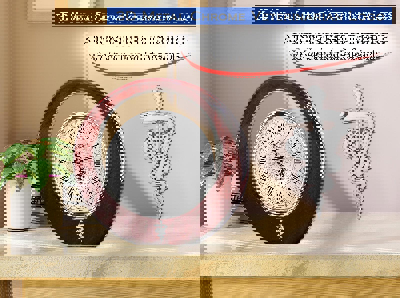 Sculpted natural cherry wood with glossy luster finish and silver veterinarian logo, cradles a silver metallic floral embellishment design element clock face with elegant roman numerals, second hand and deluxe quartz movement clock. The sophisticated designer styling of the cherry wood desk clock creates Doctor of Veterinary Medicine years of service retirement award or college veterinarian school graduation gift of distinction. A gift of time with this employee veterinarian gift clock is cherished today and always. A unique thank you or appreciation gift for the veterinarian or Doctor of Veterinary Medicine who worked tirelessly in the medical office deserves recognition. This timepiece design allows for your DVM congratulation and veterinarian school university graduate appreciation message to stand out, while preserving the artistic qualities that enable the desk clock award to be displayed with pride in the office or home. The brilliant congratulation and best retirement message of this unique clock brings out in a notable manner to the Doctor of Veterinary Medicine retiree, employee, coworker, boss and colleague. Functional and attractive define the clear circular wood tabletop clock that proudly presents etched words of recognition and appreciation.