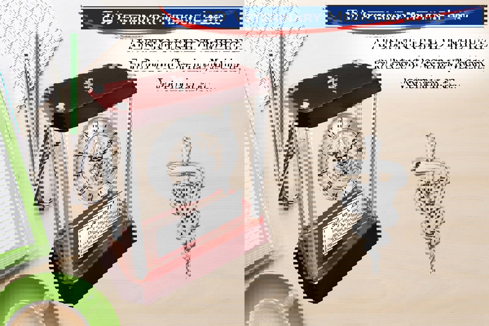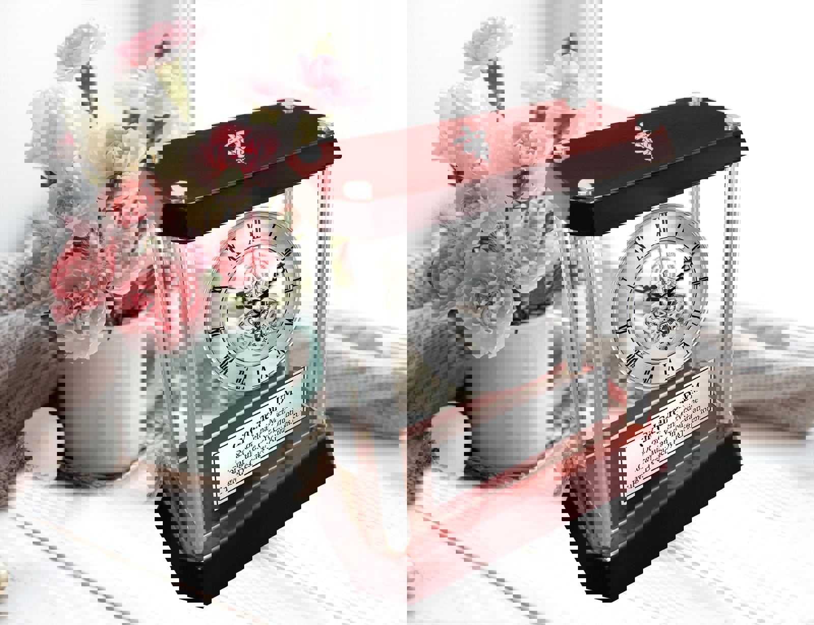 The glossy cherry wood finish top and base creates a unique appreciation personalized gift for the veterinarian. A touch of silver highlights the rich cherry finished wood trim desk engraved clock. The opulent hues of deep personalized engraved plaque give way to the radiance of your etched inscription. This DVM trophy award graduation gift timepiece embody the very essence of a quality years of service award recognition clock for the university of college veterinary school graduate, student or retiree. The passion to be number one is displayed in all success stories for any doctor of veterinary medicine employee coworker or boss. It is the desire to achieve that sets apart so give them a unique timepiece as a employee years of service award. They followed their dreams and built solid foundations from which to soar to the top. This table top glass encase silver column Da Vinci mechanical gear clock as promotion gift salutes those efforts.