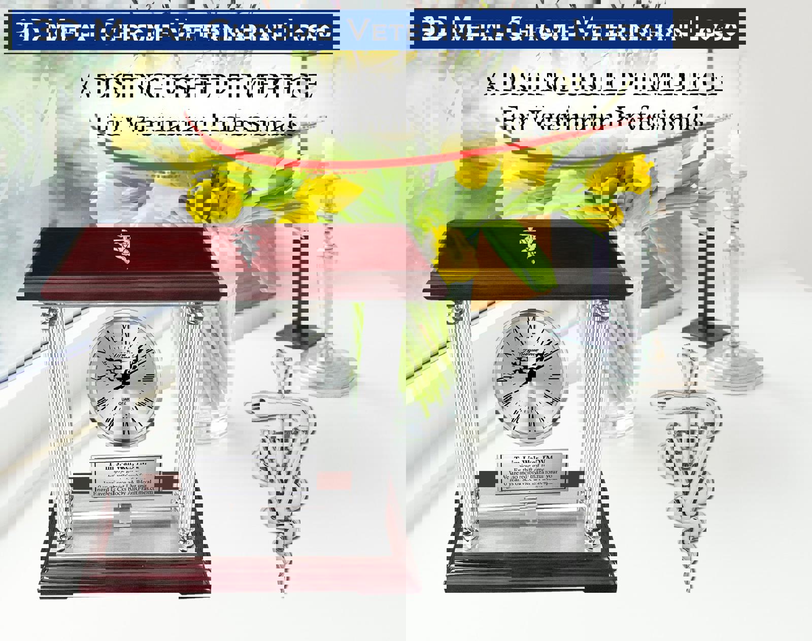 The point of giving a recognition, congratulation, service award, retirement, appreciation, graduation or thank you gifts is to enhance and recognized achievement with colleague, boss, veterinarian and veterinary assistant coworkers. The personalized tabletop mantel clock built to recognized the DVM professional, veterinarian and Doctor of Veterinary Medicine. This etched personalized award engrave clock is a unique luxury timepiece with etched plaque display. Rarely does a veterinary university school graduation, vet service award, DVM retirement gift recognition award clocks are stunning with timeless appeal. An luxurious unique engraved desk clock for Doctor of Veterinary Medicine professional that raises the bar in quality, functional and unique employee retirement, coworker service award, thank you and veterinary school graduation gift.