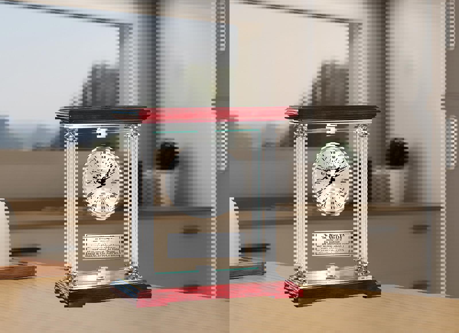 Embrace the exquisite custom craftsmanship & timeless appeal of this dramatic sought-after desktop table etched glass silver clock. The engraved desk silver glass aluminum metal mantel clock features a 360 degree manual rotating glass panel mounted with a silver clock on cherry wooden base that is surrounded by 4 silver metal aluminum pillars. With its top and bottom polished wooden base, along with a silver engraving plaque, will let your words of veterinarian congratulations shine bright in a manner to inspire all. The manual rotating personalized congratulation mantel clock embody both warmth & contemporary aesthetics for veterinary office or veterinarian home decor.