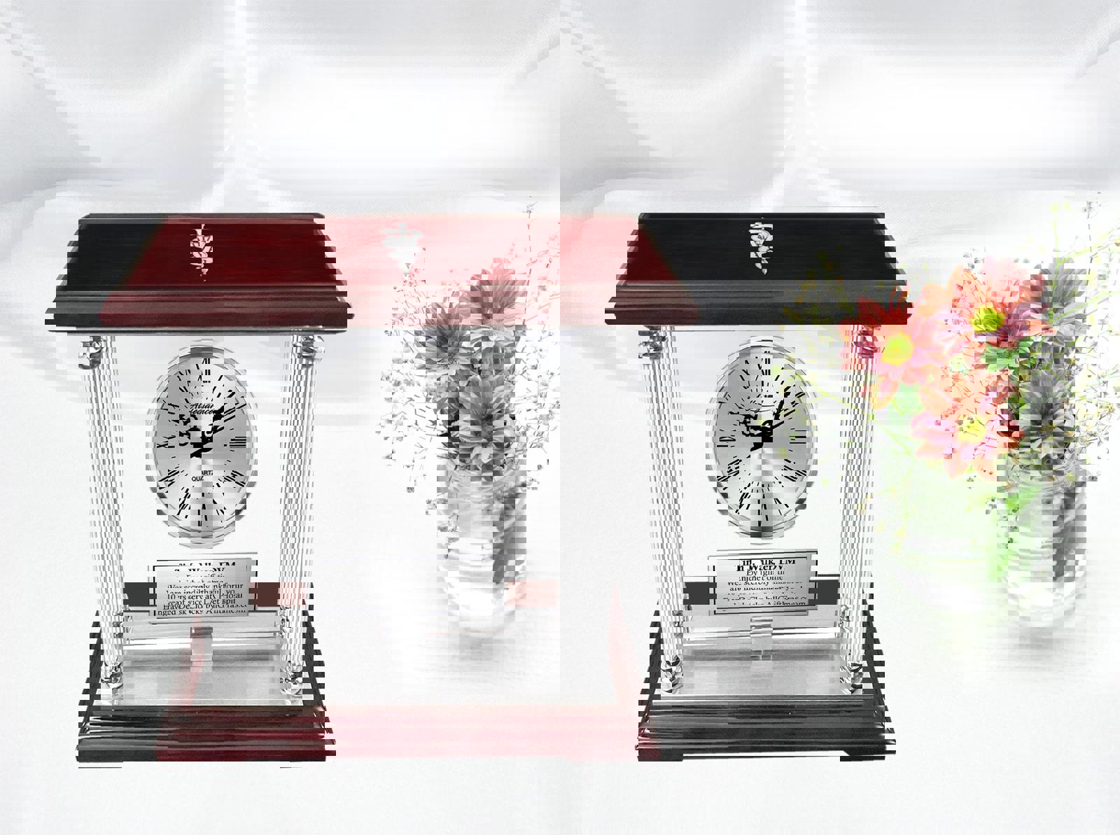 ♥ Premium Laser Engraved Quartz Movement Silver Clock Embedded in Manual Swiveling 360 Degree Glass. Four Metal Silver Aluminum Pillars with Silver Engraving Plaque on Shiny Cherry Wood Top and Base