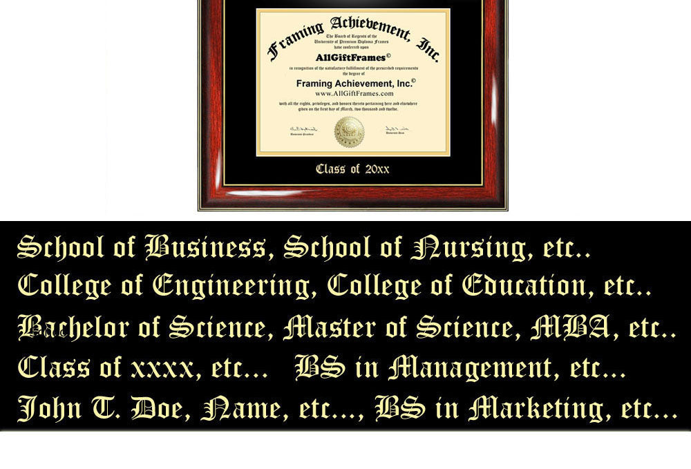 - Personalization of 1 line with maximum of 35 characters (including spaces) by Gold or Silver Embossing in Old English Font (School Name Prohibited due to copyright). Email us through AchievementGifts or AllGiftFrames if you have questions