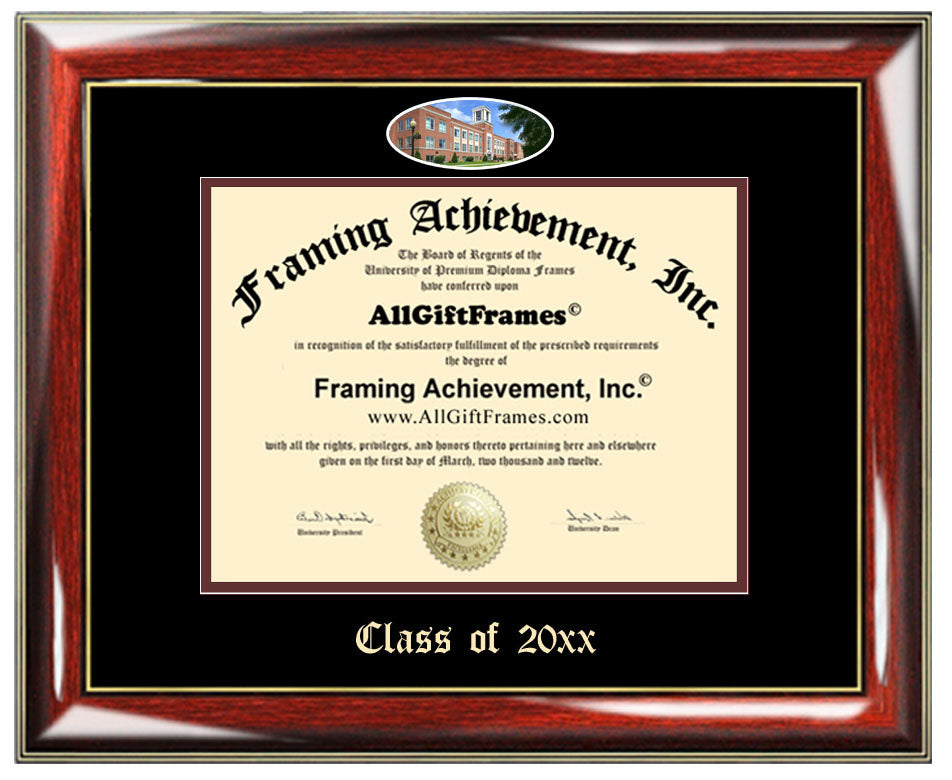 Embossed Personalized quality Concord University degree frames and certificate frames with school fisheye picture using state-of-the-art quality control techniques to display achievement. Selling a selection of high-end embossing wood custom college university Concord University WV diploma frames with campus photo image. All certificate frames are custom made to fit your diploma document sizes. Concord college diploma frame campus school photo with small fisheye college picture image as a graduation gift that showcase a beautiful unique degree or certificate case holder. These graduation custom diploma frames can display professional certifications and degrees with a campus image. This diploma frame holder case features a beautiful Embossed Document Plaque Glossy Prestige Mahogany with Gold Accents wood moulding and school photo. The college university frame includes a small campus photo image approximately 1.5H x 3W. This eye-catching stunning diploma frame makes it a unique graduation gift idea for law school, college, university, engineering, medical school, dental school, nursing graduates etc..